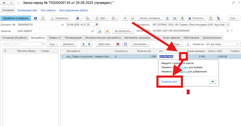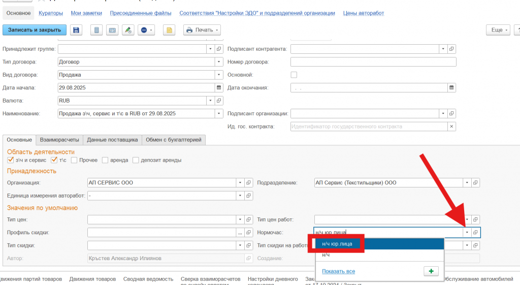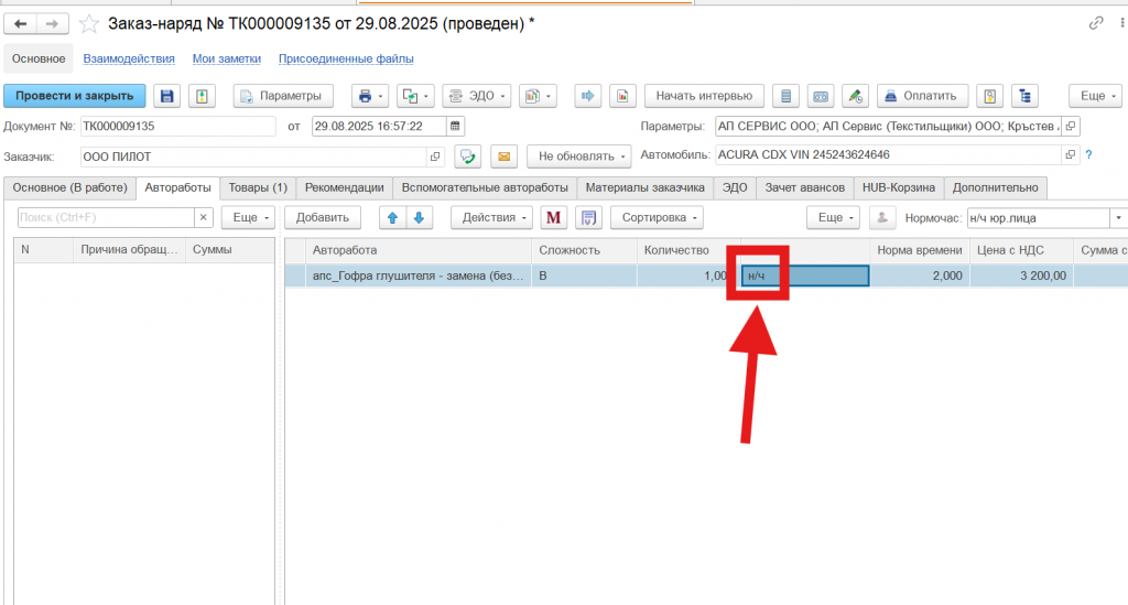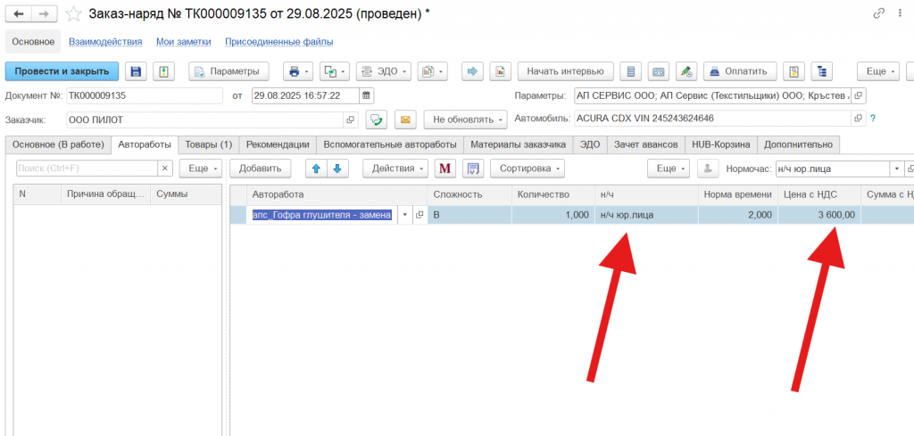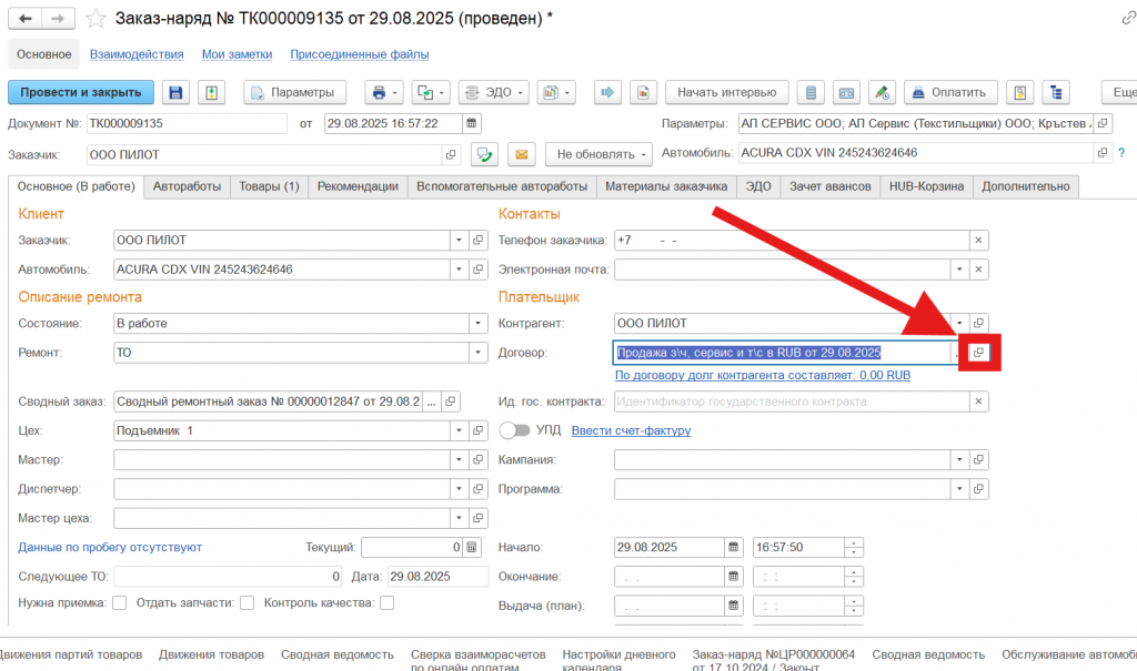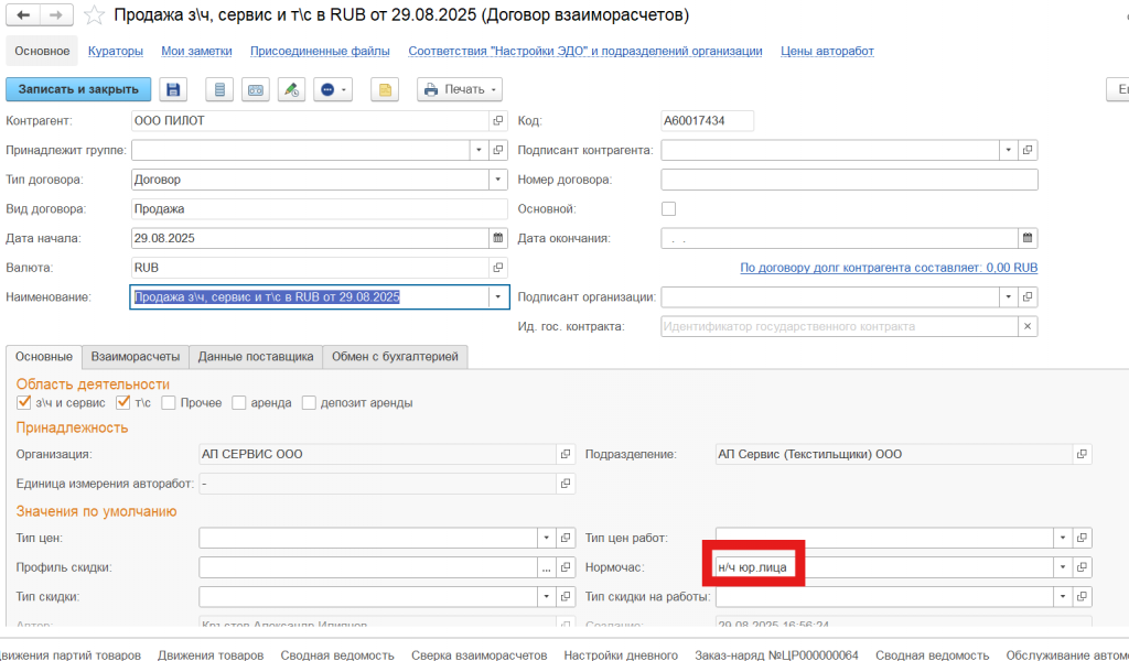 Теперь в заказ-наряде будут установлены другие нормочасы. Проверить правильный ли договор выбран для заказ-наряда можно в нем самом