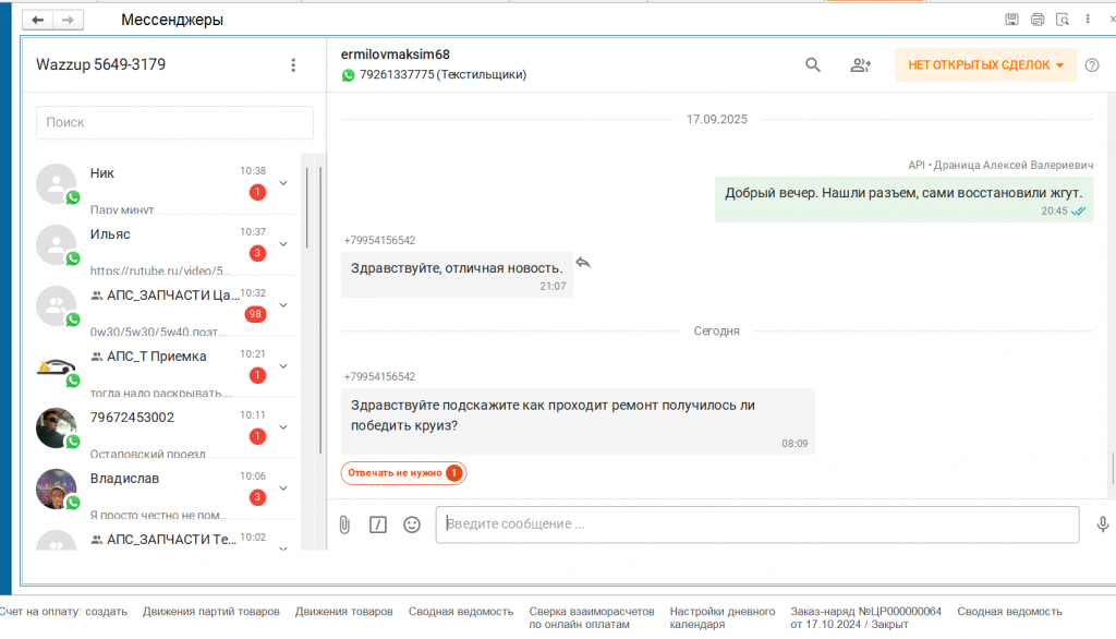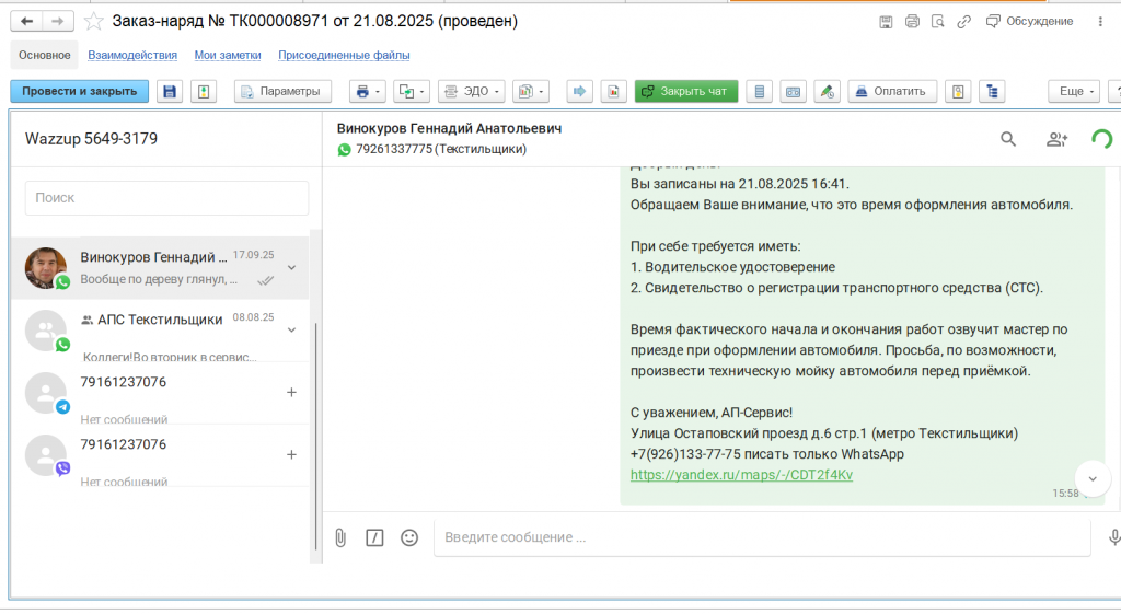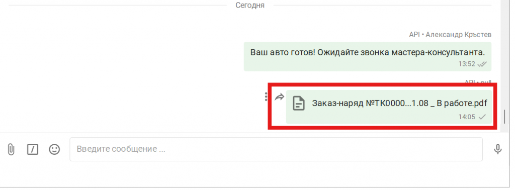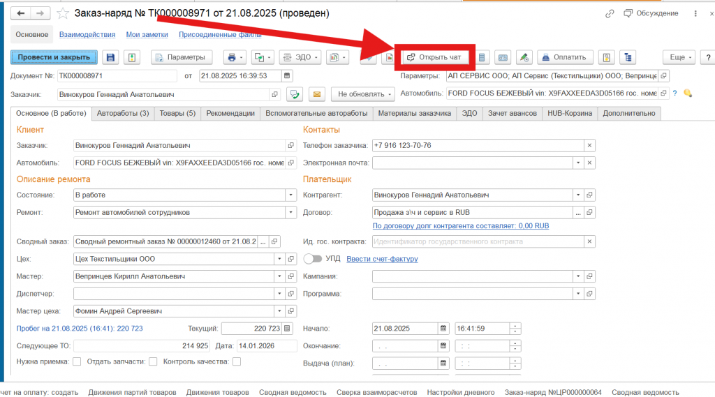 Также есть возможность открыть чат с клиентом не из списка чатов, а прямо из его заказ-наряда. Для этого в заказ-наряде нажмите на кнопку «Открыть чат»