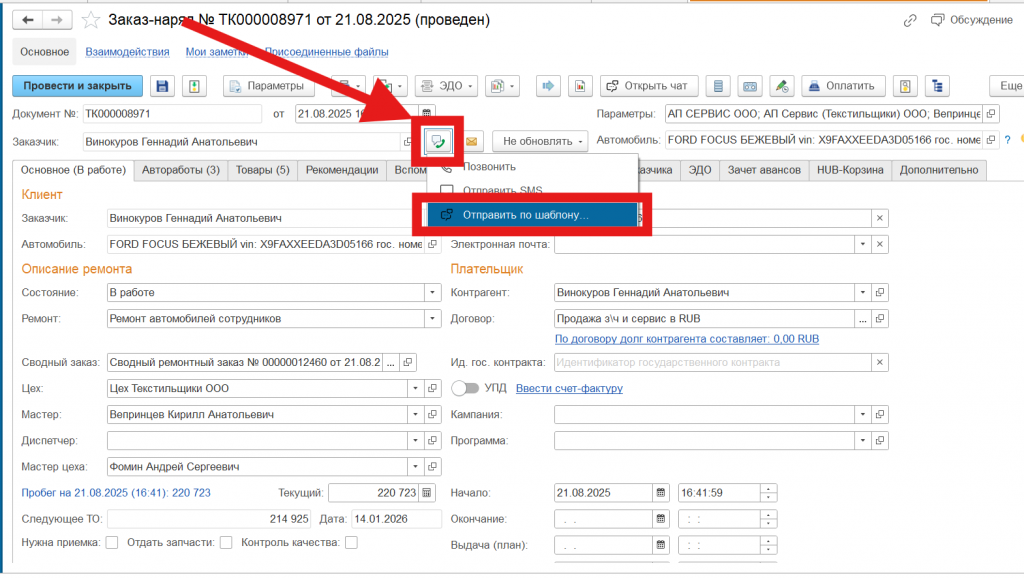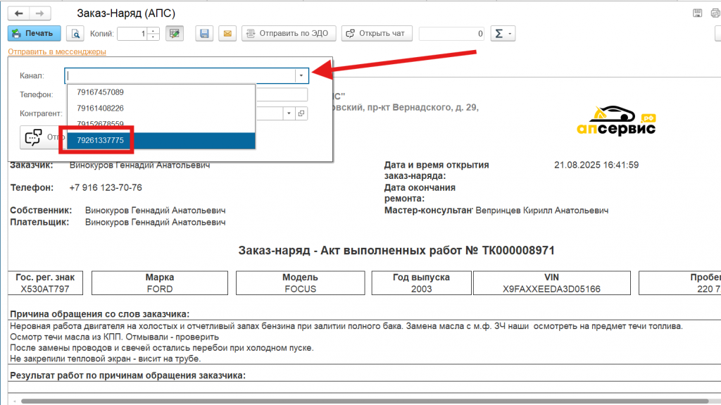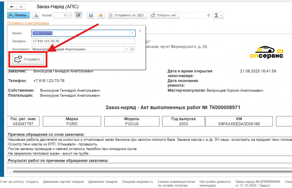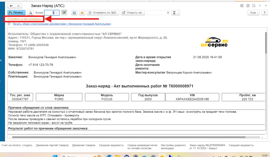 Также предусмотрена возможность отправлять печатные формы в PDF формате. Рассмотрим на примере заказ-наряда. Для этого откройте печатную форму и нажмите на ссылку «Отправить в мессенджеры»