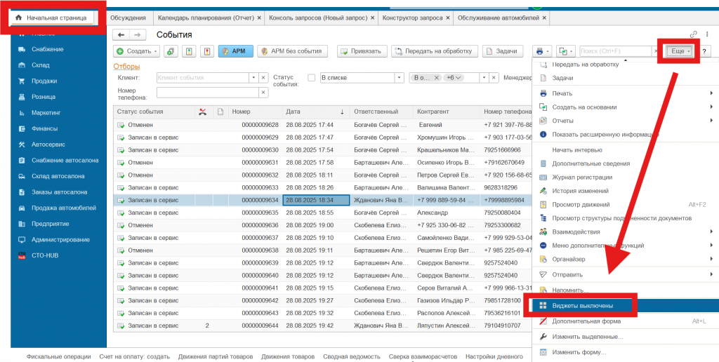 Для того чтобы включить виджет модуля на начальной странице, перейдем в подменю «Еще» и нажмем в нем на функцию «Виджеты включены»