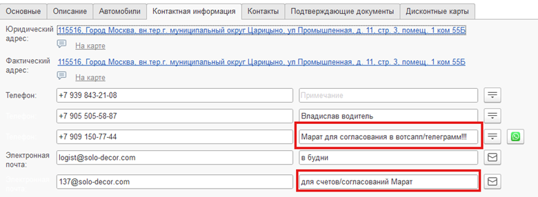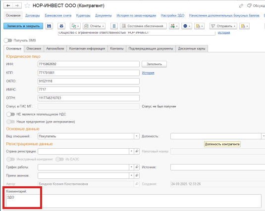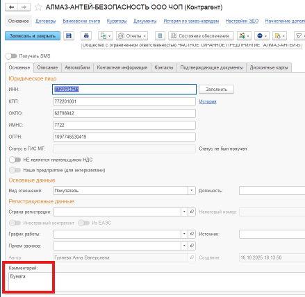 В карточке контрагента в «Комментарии» я пишу информацию по юр лицу.